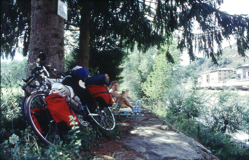 Just up ahead the road paralleled a river. There were trees lining the opposite bank, and it looked like just the place to stop. I crossed a bridge, and rode through town, looking for a fountain, but there was none to be found.