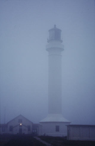 I decided I hadn't cycled all that way, with a climb back out, for nothing. So I hopped the fence, and walked to the lighthouse. When I got to the buildings, all was quiet. I still couldn't see the lighthouse. I walked to it. There was a chain link fence, with barbed wire on top surrounding it. The gate was about 50 feet from the lighthouse. I could just make it out from there. I got my picture, and walked back to my bike and rode off.